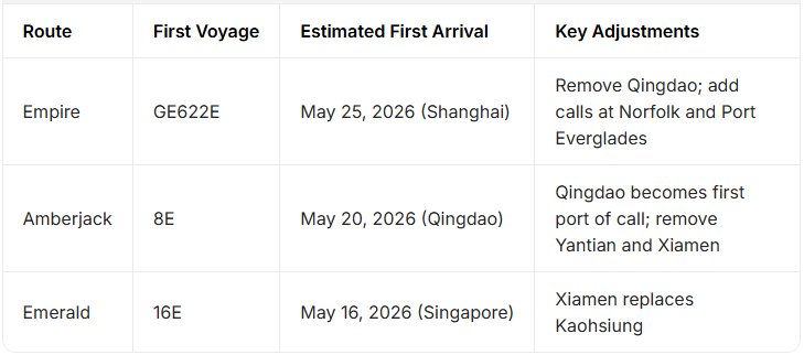 Closely monitor the actual performance of the three revised routes after their maiden voyages in mid-to-late May, especially the on-time performance at the new ports of call on the Empire route and the transit efficiency impact of Qingdao’s first-call status on East China cargo. If you regularly export from Xiamen to the US East Coast, the new direct service on the Emerald route could bring notable time savings.