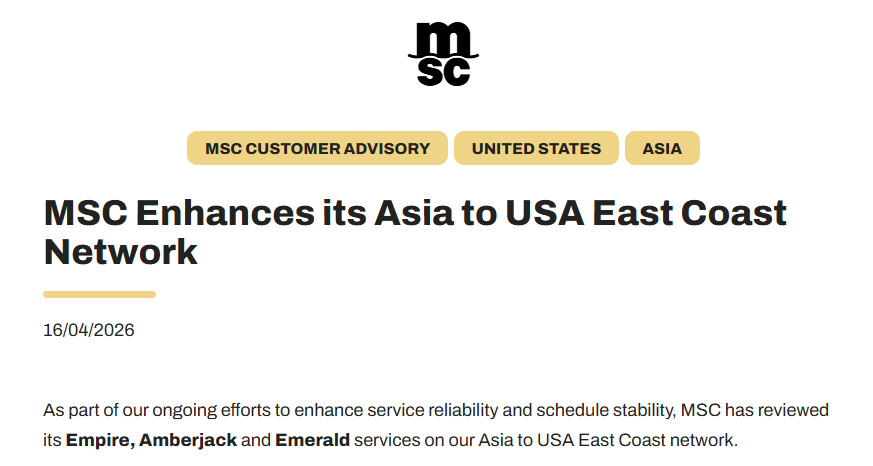 The pace of adjustment in the 2026 global container shipping market has accelerated markedly. On April 16, Mediterranean Shipping Company (MSC) announced a systematic restructuring of its Empire, Amberjack and Emerald services on the Asia–US East Coast network, involving additions and removals of port calls across Asia and North America.